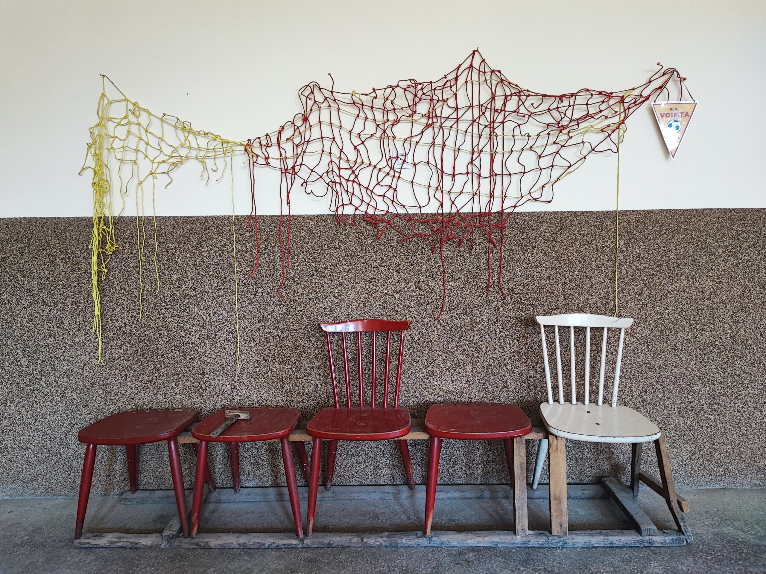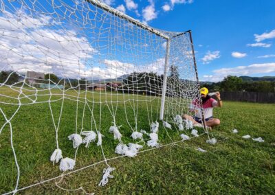 Throughout the residency, I worked on my ongoing project “3 corners = 1 penalty,” creating a site-specific installation featuring handmade macramé football goal nets on the playground and a friendly match as part of the inauguration of the work. This match took place after the opening at the Cultural Center in Săcel on July 14th. The event was well attended and involved many local children and young people. The installation is permanent, meaning it remains for use by the community.